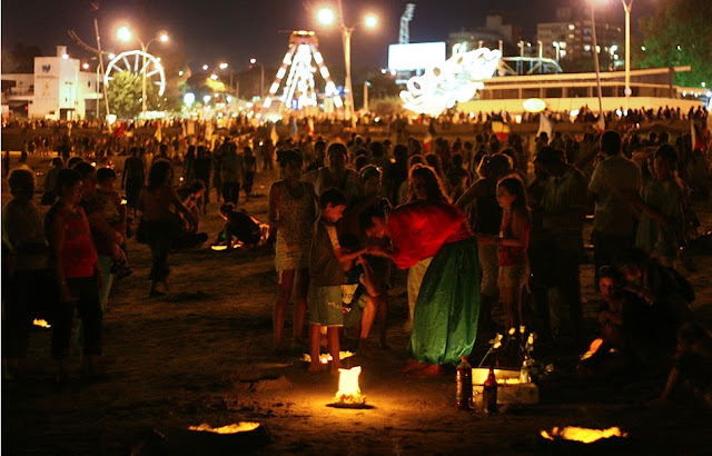 Tras caminar por el parque Rodó, ya de noche, nos acercamos a la playa Ramírez para ver qué era eso del Iemanjá. Se trata de una celebración africana traída en la época en la que había esclavos y que se celebra en toda Sudamérica. Los fieles se acercan a la playa donde hacen ofrendas, bailan y rezan. El aspecto de la playa es especial, nos recordó a los júas de la noche de San Juan en Málaga. No hay hogueras, pero sí velas enterradas en pequeños agujeros en la arena y muchísima gente.